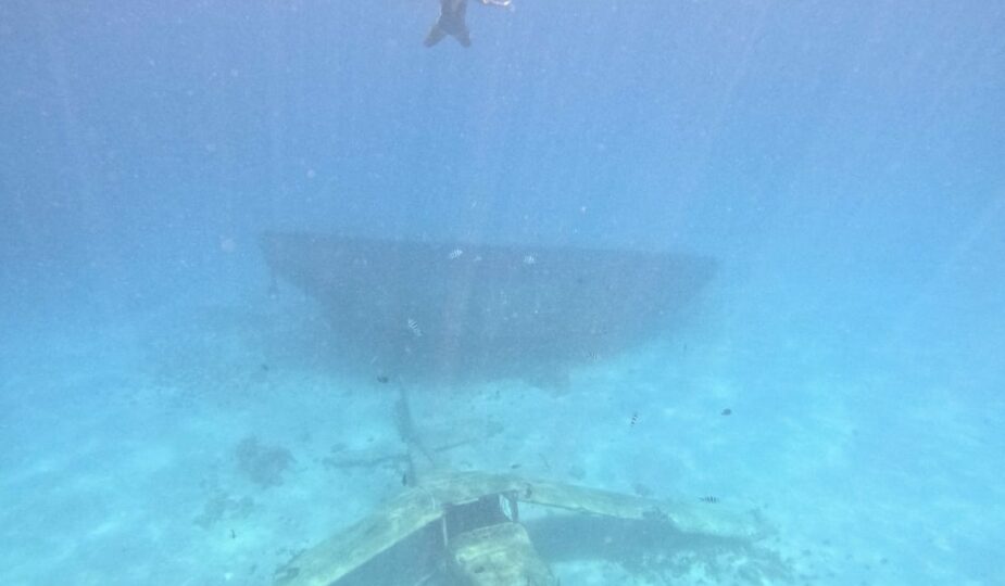 Continuez votre route (15-20 min à la rame environ) vers le lagon. Ici, vous aurez la chance de voir 2 épaves de bateaux et une épave d’avion. Ils ont également installé un coeur en rochers au fond de l’eau, et un bureau avec chaise et ordinateur. Parfait pour une photo originale en plongée ou en apnée.